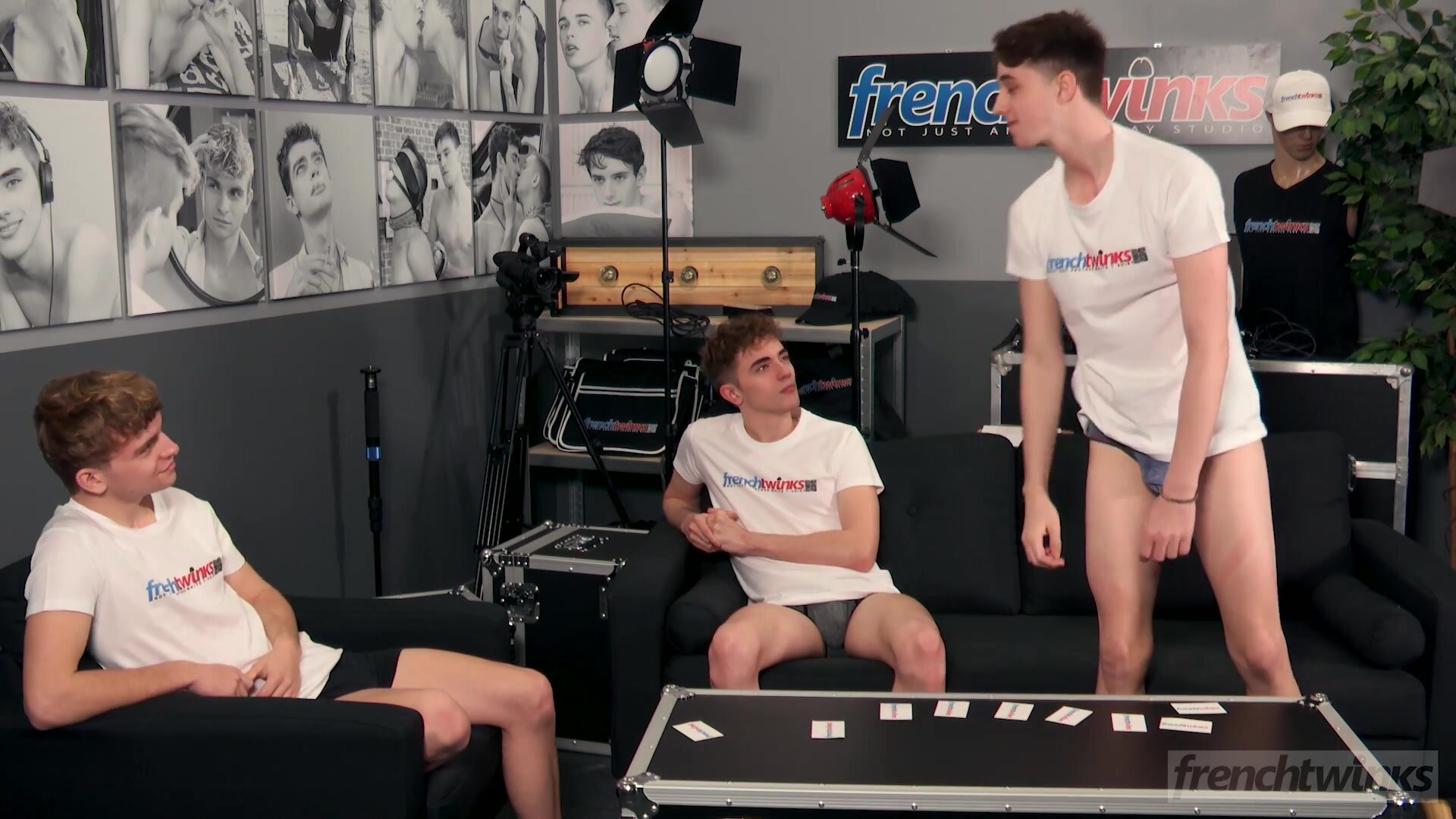 The shooting days are sometimes long and luckily the boys always find something to do to pass the time. Timeo, Valentin and Leo experiment with the "Times'Up" alike mime game created by French Twinks. Obviously the expressions to mimic are based on sex and after some giggles, the three twinks are very hot and bothered.