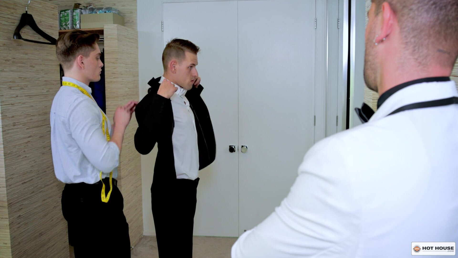 While Groomsman Shane Cook tries on his suit and awaits alterations from Tailor Jay Tee, the Groom Chris Damned sits back and enjoys a fat cigar. As Chris sits back, Jay measuredly slips down Shane's pants and underwear to reveal his fat uncut cock that he instantly starts sucking. When Shane wants a taste, Jay bends over to watch Chris stroke his meat while Shane licks Jay's ass. Right in front of Chris, Shane enters Jay from behind and quickly begins an intense bareback pounding. Jay and Shane move to the bed where Jay gets laid down and sucked before Shane fucks his ass again. While Shane keeps drilling Jay's hole, Jay strokes his cock until his load shoots onto his abs. All it takes is a few more strokes in Jay's ass and soon, Shane is adding his cum to the mix.