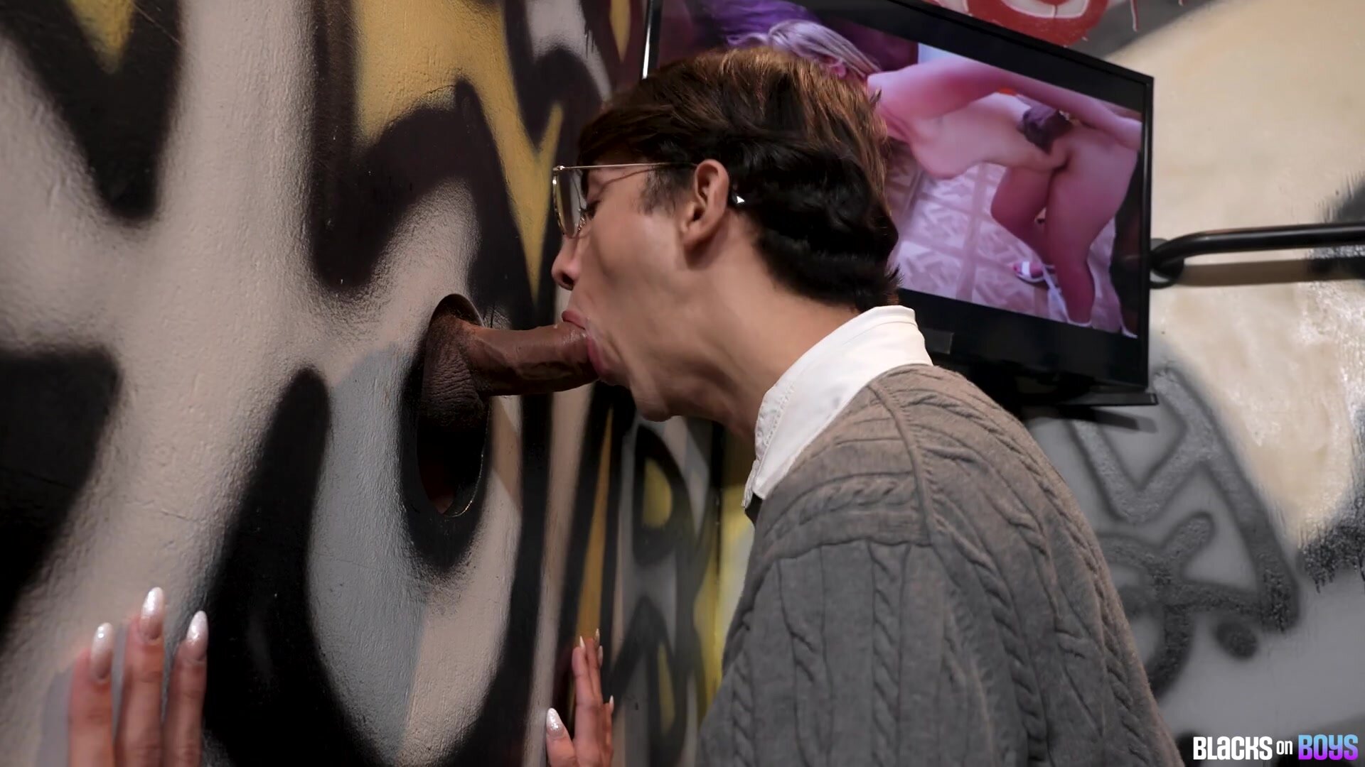 Alex is a shy little thing just moved to the big city from his very conservative upbringing to go to college. He has tried hooking up with guys in the apps but is always to shy too follow through so has found his way to the glory hole to get some. There is this one dick that always seems to be there when he is and it's HUGE. He keeps thinking about it all the time when he is at home and decides to write a note to give him if he ever sees him again. Well this afternoon he is in luck and on his knees his favorite cock comes through the hole. He is so excited and sucks right away until he remembers his note in the pocket and hands it through the hole asking him to knock if he wants to follow him home, and knock he does. Back at Alex's bedroom the owner of the giant dick Andre surveys the sweet little college boy in front of him knowing he is going to destroy that ass. Alex is waving his whole ass at him begging for just that in fact. Andre puts the new boy through his paces with Alex begging and moaning the entire time. Once on his back Alex can hold off no more to Andre's pounding and shoots a massive load all over himself and then scoops some of it up to taste as well. Andre starts fucking hard to build up his own load and empties it out on Alex as well.