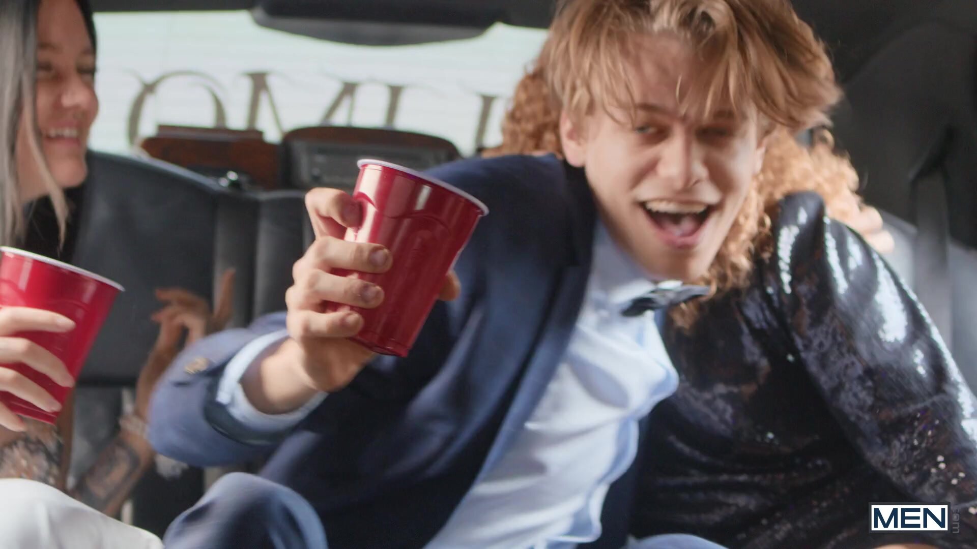 After their little detours with their dates' brother and dad, secret boyfriends Leo Louis and Enzo Muller are finally in the limo with the girls on the way to the prom. After the good music and the party atmosphere make them get a little carried away, the guys start kissing each other and even take their dicks out! The girls bail, and Enzo sucks Leo, then the top rims him before fucking him missionary on the backseat. Enzo rides his blond bf, and Leo pounds his hole, pulling out to cum on the bottom's ass before putting his dick back inside till Enzo cums.