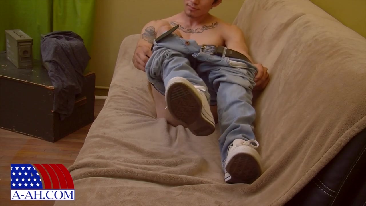 There are a lot of tough jobs in the Marine Corps, but pretty much the toughest jobs involve infantrymen. They are the boots on the ground who put it all on the line. Lance Corporal Hector was an infantry mortarman. His job was to work with small ground units to put mortar rounds on the enemy positions. Hector ultimately did not have to go into combat, but he and his unit sat off shore, waiting for the call, and ready to take the fight to the enemy if needed. He grew close to his fellow Marines, and that experience will always stay with him. When he was not handling weapons, he makes do with handling his own big gun, and he gets right to it. Even through loose fitting denim, it does not take long to see a bulge working up underneath. He reaches down and pulls out a nice thick barrel of a cock before tossing his shirt off to the side. Like most Marines, he has a fair assortment of tatts that set off his tight toned body perfectly. He lays back and starts in on some more serious jerking before he yanks his pants down to his ankles and shows off a set of low hanging cum filled balls. He takes a nice fist full of cock and starts taking nice long strokes at it. In moments, he is rock hard. He jumps onto his knees and gives up a nice profile view of his tight ass, before easing back and tightening his grip. He edges himself closer as he starts pounding harder on his tool. He lays back and his abs start to tense as he draws close to releasing his load. He bites his lower lip and then sprays a huge load all over his abs. Shot after shot streams from his cock until he's unloaded every round. The parting shot is his heavily cum glazed abs gleaming in the light.