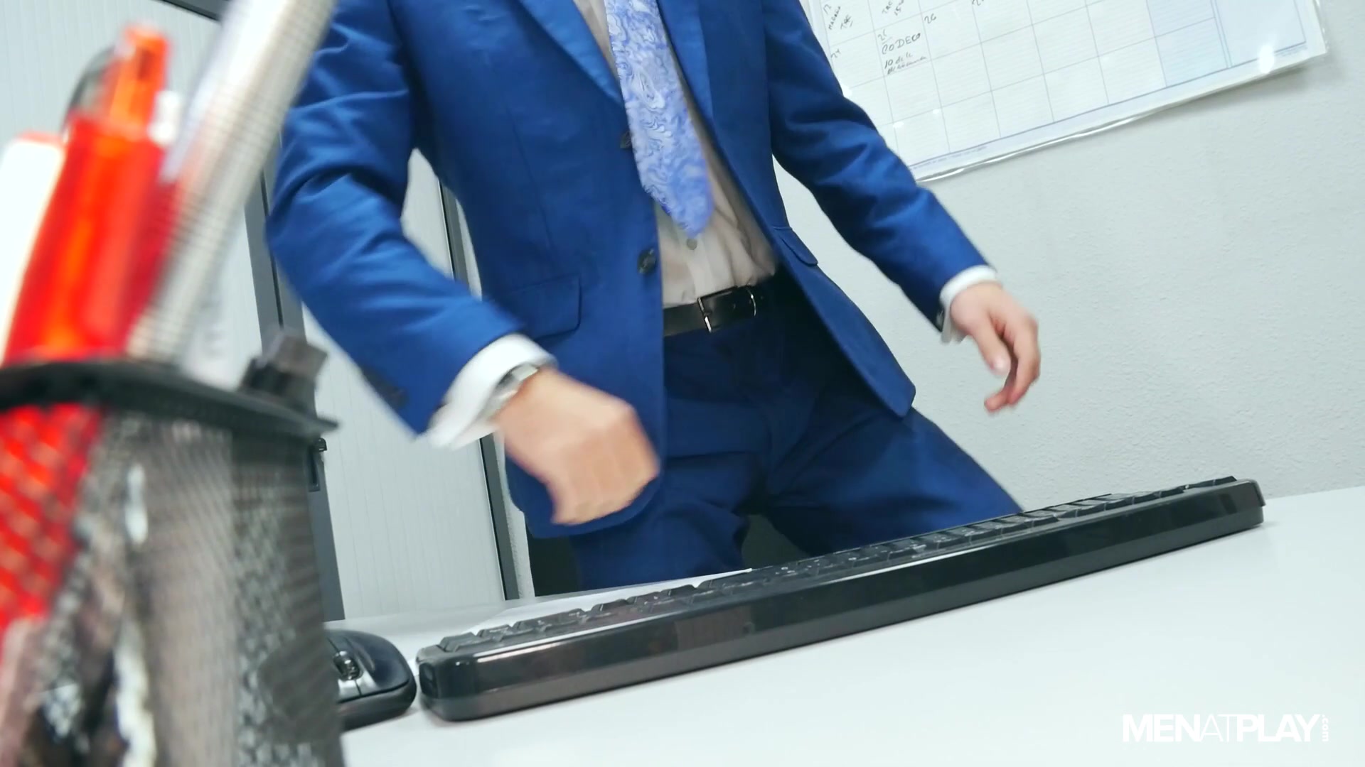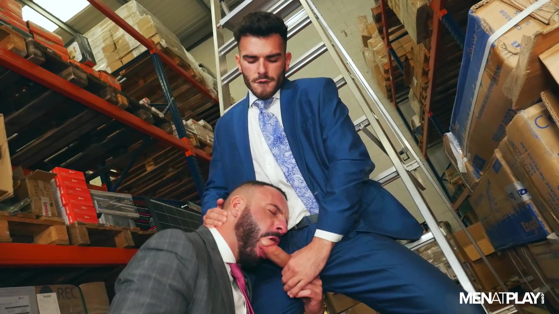 Later, when Leo asks Pol if he’s done -- he gets asked in return "Are You Done?". Pol noticed the boss jerking off earlier and wonders what else Leo does with his new employees. While Leo denies everything - Pol knows and likes what he saw! He likes them big and wants to taste and ride the boss’ thick cock. Leo wants to work less and play more too - the two suited studs flip-flop fuck in the warehouse.