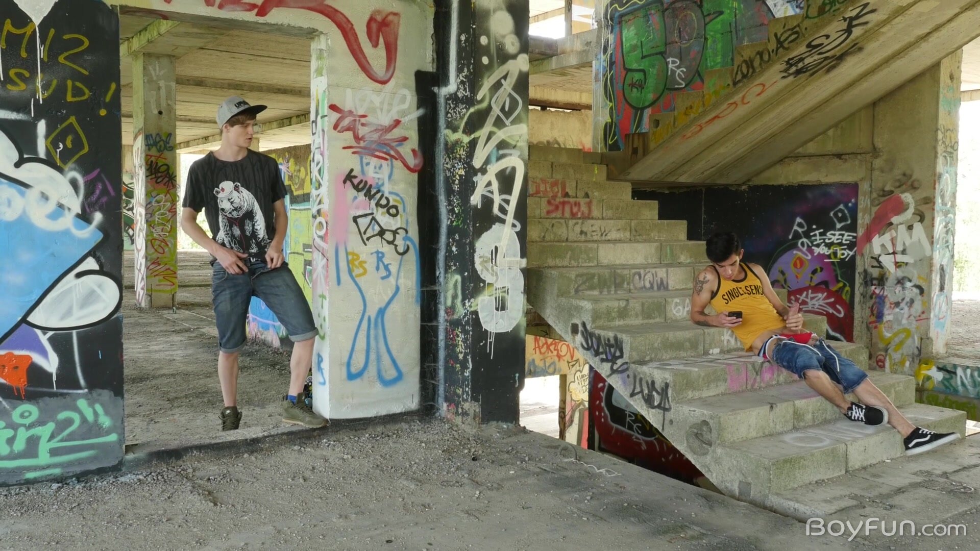 Handsome skater boy Antony Carter is in the right place at the right time, strolling through the abandoned warehouse outside of town. It's where a lot of the local guys go to smoke, drink or practice their graffiti skills, but that's not all that goes on there. Roman Capellini is the kind of boy who loves to have a good wank when the mood takes him, hauling out his meat in the woods, on hikes or when he's just hanging out waiting for a buddy to show up. His experience of dick-related BoyFun might be limited to masturbation, but when he's started by Antony watching and wanking his own big uncut meat he's soon exploring a little more than perhaps he expected. With a rigid dick offered for him to taste his inexperienced lips wrap around it, precum leaking onto his tongue as he slides his mouth along the warm pole, his own cock still bulging in his grip as he slurps and sucks his new friend. Antony has already revealed his hornyness, spying on the lad and wanking off to the sight of Roman's big piece being pleasured, so it's no wonder he's soon returning the favor and working the young man's immense tool with his lips and tongue. With their smooth and athletic twink bodies totally revealed the passion can only rise. Antony takes a seat on the cold and hard concrete steps, his engorged inches rising up and ready for Roman to experience inside him. The tanned boy slides down, tentatively. His snug pucker welcomes the invading shape as Antony's bare cock oozes precum inside him. As the pace quickens Antony offers a reach around, fucking his buddy in the butt while he strokes his new pal's erection, his suckable balls bouncing up and down with every demanding thrust. With animalistic urgency Antony takes the boy from behind, his meat crammed into Roman's hole, his hips bouncing while their shared pleasure grows more intense, their heavy nuts swinging and slapping around. Any boy would be on the edge by now, and with a final rapid pounding Antony pulls his dick free and heads up to tower over his new friend, cum soon launching from his helmet to rain down over Roman's chest and face. The smell and feel of fresh semen splashing down over him is all the boy needs to be wanking out his own copious load, pumping thick gooey cream as their moans of pleasure begin to subside. As the two part company Roman is sure glad he stopped to jack off in the old warehouse.